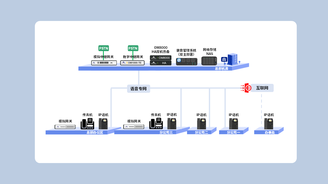 · 部署支持双机热备的融合通信平台,实现总部及分公司分机的电话和传真接入