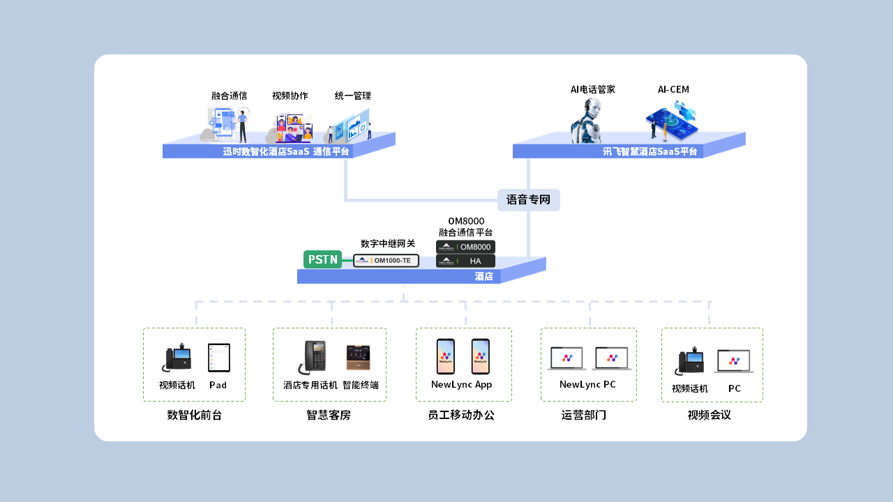 近年来,AI智能电话交互技术开始应用于各行各业,在传统的IP化通信解决方案的基础上采用人工智能语音技术赋能智慧通信,大大提高了各企业单位的工作效率。在迅时数智化酒店通信解决方案中,我们基于NewLync SaaS 平台,可为酒店灵活部署:酒店智慧前台、IoT智慧客房、NewLync 高效协作、UMS统一管理等功能模块。赋能智慧酒店建设。