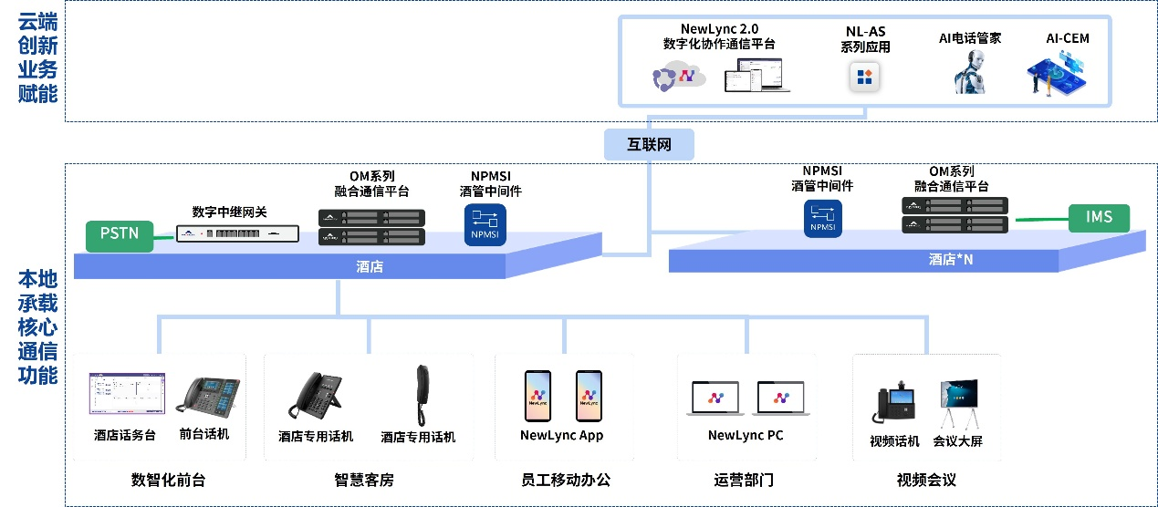 · 本地则承载核心通信功能,涵盖前台话机、NewLync多终端、酒店专用话机、视频话机、会议大屏等设备,满足不同场景的通信需求。