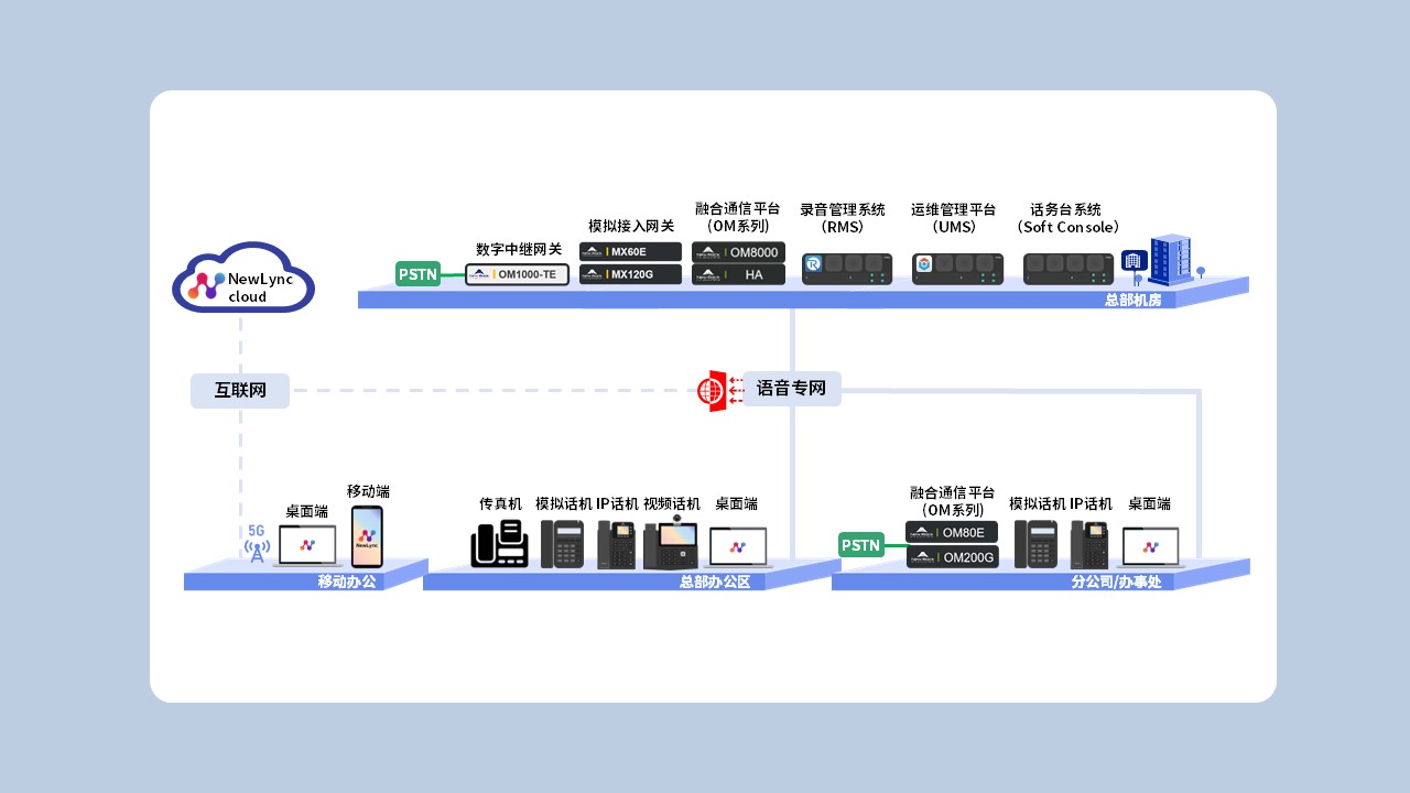 迅时大中型企业语音通信系统方案,以迅时OM系列电话交换机(IP-PBX)为核心,提供全面的沟通协作及便捷的开放能力,支持语音通话、视频通话、高速传真、电话会议、电话录音、移动分机等“一站式”业务融合,既适用于数百人到数千人规模的大中型企业,也能通过设备堆叠或组网服务于数万人规模的集团企业,具有高可靠、高安全、高稳定、高性价比的特点。