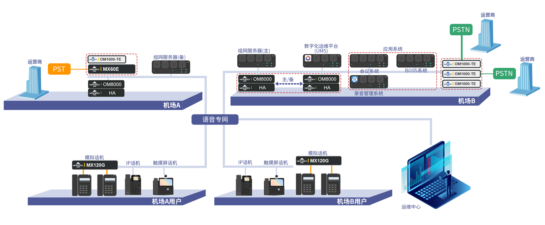A机场:部署一套(2台)OM8000融合通信平台,采用双机热备模式部署;一套组网管理系统和一台数字中继网关。