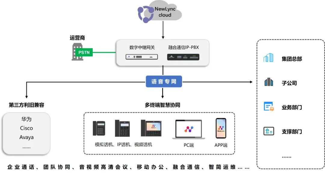 Newlync2.0支持普通话机、IP话机和软电话等终端,在不改变传统话机沟通习惯的基础上,快速实现系统扩展,简化内部呼叫操作,实现自由、灵活、高效的办公协作。