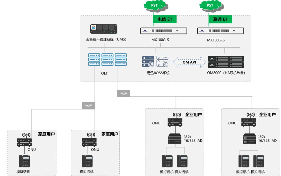 OM8000融合通信平台通过OMAPI开放接口与发电站现网语音系统对接,提供话单计费/出账、话费查询/催缴、停/复机、电话彩铃、话务台等功能。
