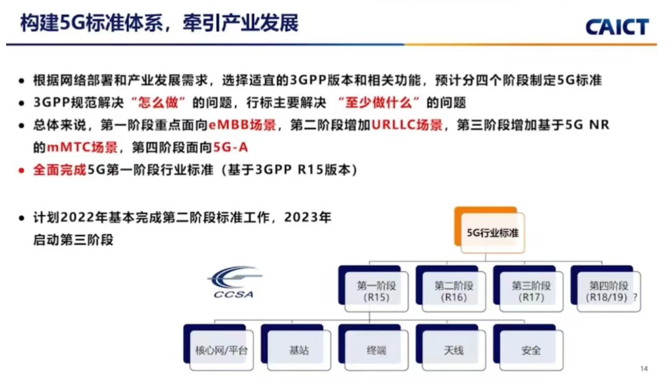 “构建5G标准体系,才能牵引产业发展,5G增强标准将助力行业应用。”王志勤表示,要根据网络部署和产业发展需求,选择适宜的3GPP版本和相关功能,3GPP规范解决“怎么做”的问题,而行业标准主要解决“至少做什么”的问题,制定5G行业标准预计分为四个阶段:第一阶段重点面向eMBB场景(R15),第二阶段增加URLLC场景(R16),第三阶段增加基于5G NR的mMTC场景(R17),第四阶段面向5G-A(R18/R19)。目前,已经全面完成5G第一阶段行业标准(基于R15),计划2022年基本完成第二阶段(面向R16)行业标准工作,2023年将启动第三阶段面向R17的行业标准制定。