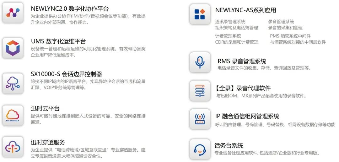 作为新一代企业融合通信解决方案的领先提供商,迅时通信自2003年成立以来,始终专注于音视频通讯产品的创新设计和研发,为广大运营商、政府机构及企业提供高效、智能、可靠的通信解决方案。