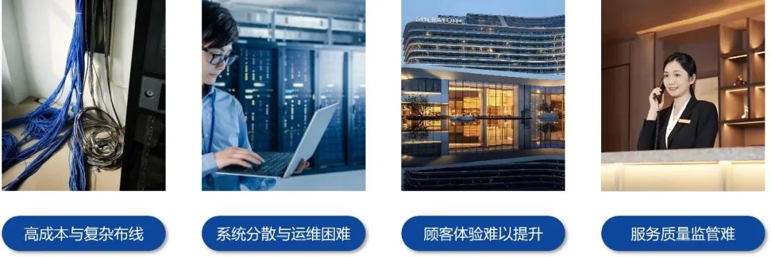 传统酒店通信系统存在诸多问题,如布线复杂、运维成本高昂、扩展性差等,难以满足现代酒店对于高效沟通与优质服务的需求。系统分散导致运维困难,顾客体验难以提升,服务质量监管也存在挑战。