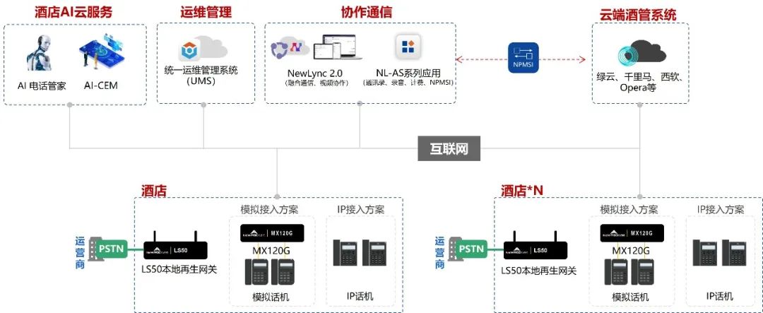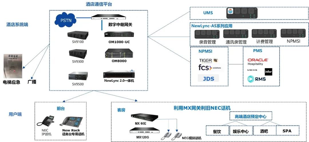 本地则承载核心通信功能,涵盖前台话机、NewLync App、NewLync PC、酒店专用话机、视频话机、会议大屏等多种终端设备,满足酒店前厅、员工移动办公、运营部门视频会议等不同场景的通信需求。