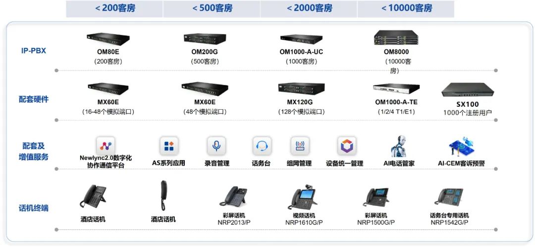 迅时通信根据酒店客房规模,提供从IP-PBX到配套硬件及增值服务的全系列产品选型,如OM80E、OM200G、OM1000-A-UC、OM8000等IP-PBX设备,以及MX60E、MX120G、OM1000-A-TE等配套硬件,还有彩屏话机、话务台专用话机、视频话机等多种终端设备,满足不同规模酒店的通信建设需求。