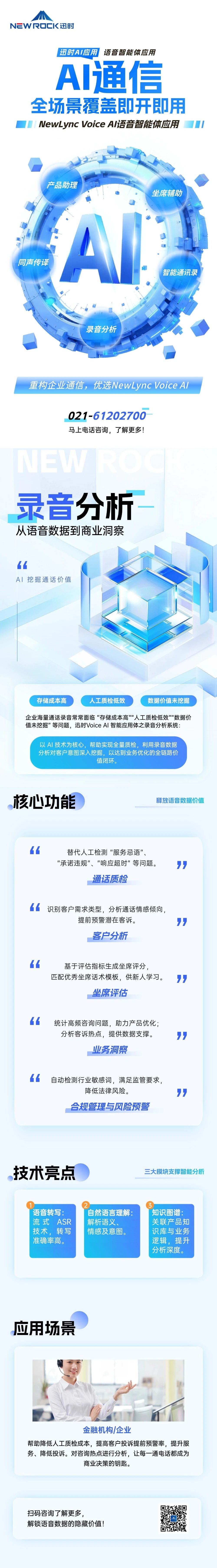 企业海量通话录音常常面临“存储成本高”“人工质检低效”“数据价值未挖掘”等问题,迅时Voice AI智能应用体之录音分析系统,以AI技术为核心,帮助实现全量质检,利用录音数据分析对客户意图深入挖掘,以达到业务优化的全链路价值闭环。