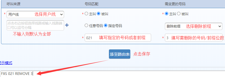 表示对来自FXS端口(用户线)呼叫,将其以021开头的被叫号码的前3位去掉。