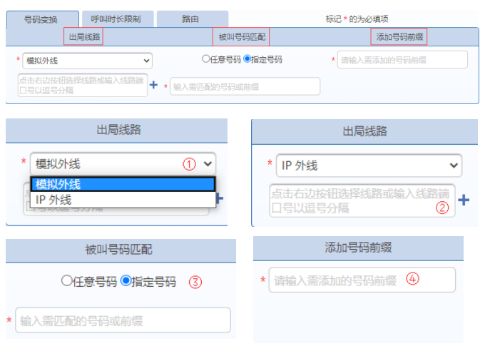 例如号码变换模块是由出局线路、被叫号码匹配和添加号码前缀组成: