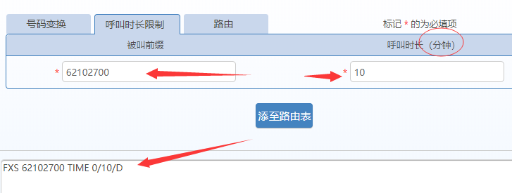 而新增的呼叫时长限制模块则更简单了,只需填写被叫的号码或前缀,然后设置呼叫时长(分钟),再点击添至路由表即可。