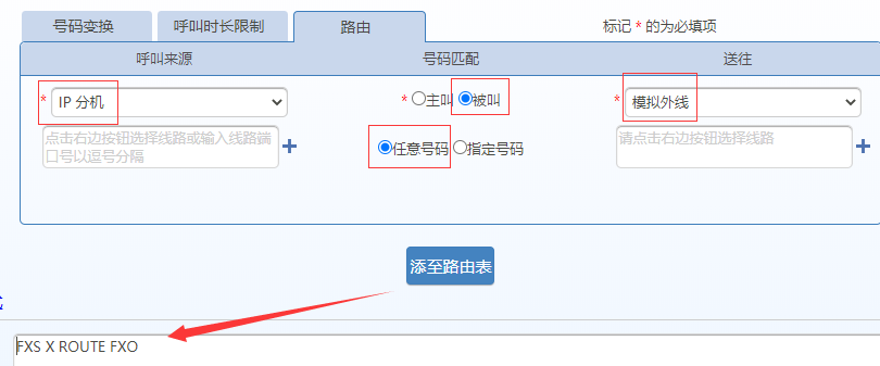 例如以下图中的路由FXS X ROUTE FXO表示从IP话机侧来的任意呼叫均从任意模拟外线呼出。