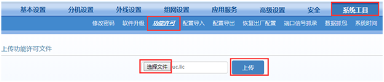 再次登录设备,点击“系统工具—软件许可”,上传UC软件许可(uc.lic)。上传完成后,设备将自动重启。