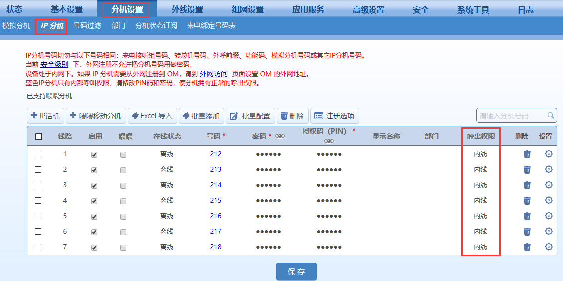 出于安全考虑,OM系列出厂默认IP分机呼出权限为内线,如果出现分机外呼提示权限不足,确认分机设置-IP分机(模拟分机)中权限是否开通,修改分机权限需要同时修改对应分机的密码和PIN码生效,否则修改不成功。