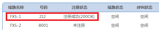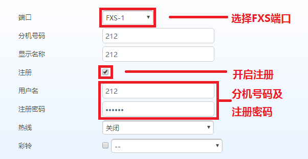 步骤3.在“用户线配置>用户线功能”页面下,配置IP分机号码及注册密码;(FXS-2/3/4同理)