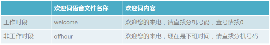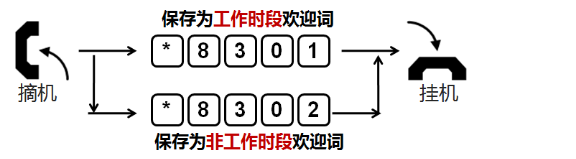 摘机按*8301,用这段录音替换工作时段欢迎词;按*8302,替换非工作时段欢迎词。