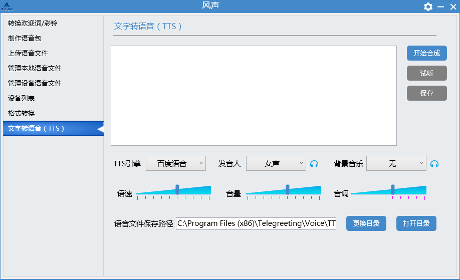 打开风声,点击“文字转语音”,在文本框内输入所需的欢迎词文字。如:“欢迎致电上海迅时,产品咨询请按1,技术支持请按2,查号请拨0”,然后选择TTS引擎(百度/讯飞)、发音人、背景音乐,并根据需要调整语速、音量、音调等,点击“开始合成”。