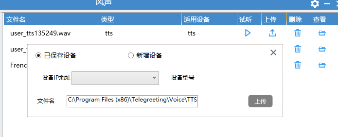 试听满意后,点击“保存”按钮,在弹出的页面直接将语音文件上传到设备。