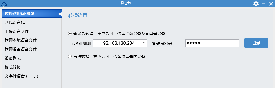 打开风声,点击“转换欢迎词/彩铃”,选择“登录后转换”,并登录设备。
