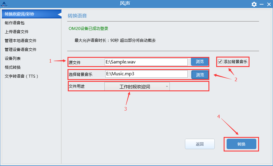 选择源文件、背景音乐(可选)、选择文件用途,点击“转换”按钮开始转换语音文件。
