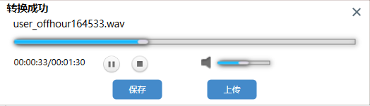 转换成功后,可试听转换后的语音文件。试听满意,可点击“上传语音文件”,自动上传至之前登录的设备,并保存到本地。