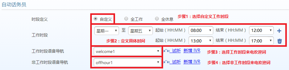 3、自定义模式允许在不同的时间段播放不同的欢迎词。比如,早上9点到下午6点,播放工作时段的欢迎词;其他时间播放非工作时段的欢迎词。