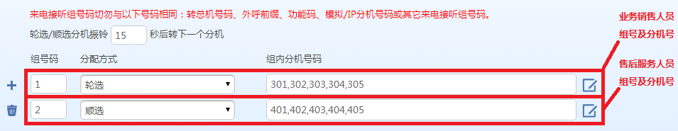 -来电接听组号码切勿与“转总机号码、外呼前缀、功能码、分机号码或其它来电接听组号码”相同。