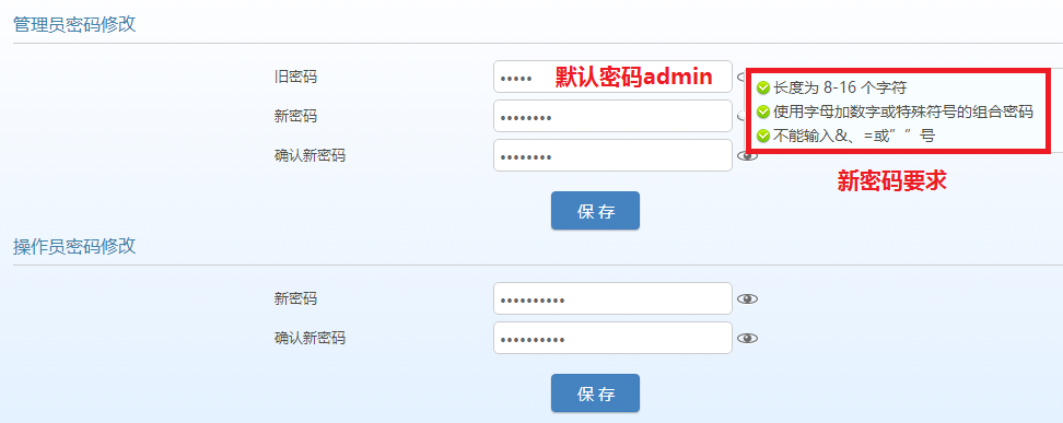 登录IP-PBX管理界面,在“系统工具>修改密码”页面下,修改管理员和操作员Web登录密码并保存。