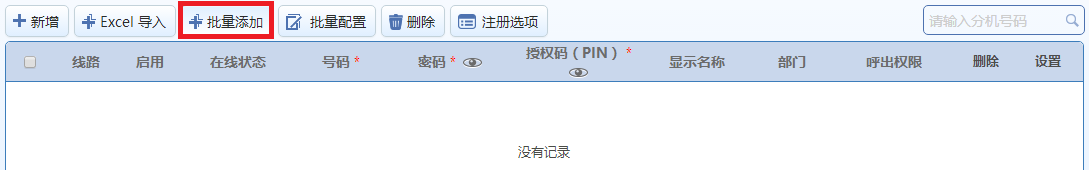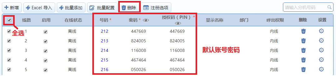 步骤1.登录IP-PBX的Web管理界面,在“分机设置>IP分机”页面下,“全选”并“删除”默认IP分机号码;