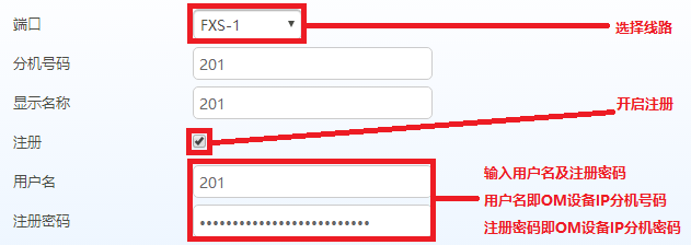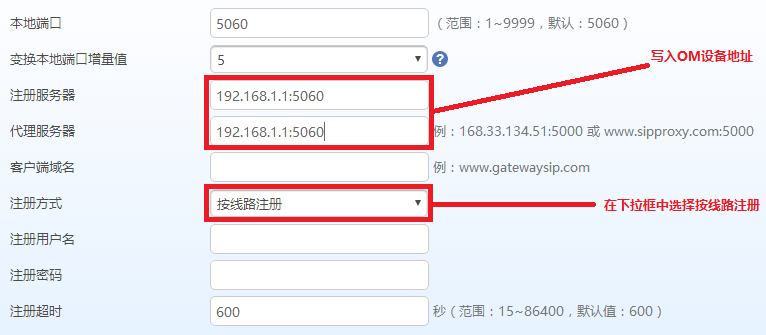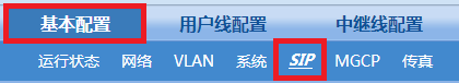点击“基本配置>SIP”,输入IP-PBX的IP地址,选择“按线路注册”,并保存。