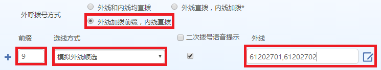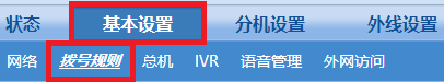 点击“基本设置>拨号规则”,外呼拨号方式选择“外线加拨前缀,内线直拨”,按照规划设置拨号规则,并保存。