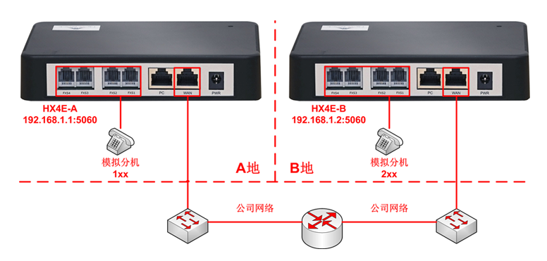 下面我们以两台迅时HX4E-4S语音网关产品为例,介绍如何通过语音网关的点对点配置实现超便捷且低成本的跨区域沟通。