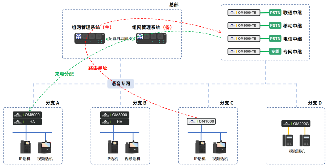 复杂组网:组网 OM 间分机号码有重复的可能。OM 需要分区域配置,同一区域内的分机号码不可重复,不同区域间的分机号码可以重复。